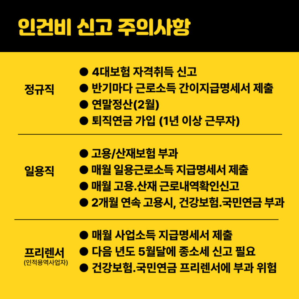 정규직, 일용직, 프리렌서 별 인건비 신고 시 주의사항은 다음과 같습니다.
